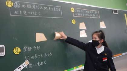 同じ図形はどれなのかを考えています。 その根拠を前に出て説明していました。
