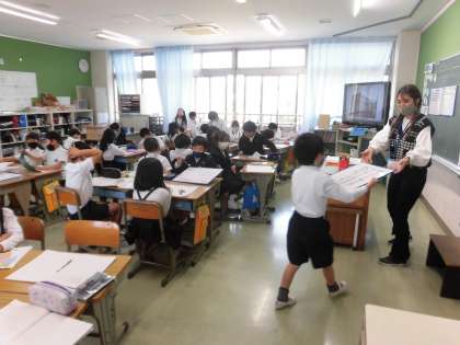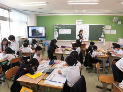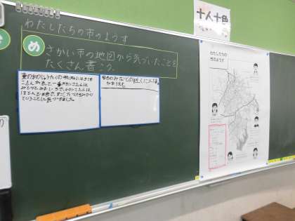 「わたしたちの市の様子」 地図から気づいたことを、グループでホワイトボードにまとめて発表していました。