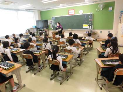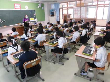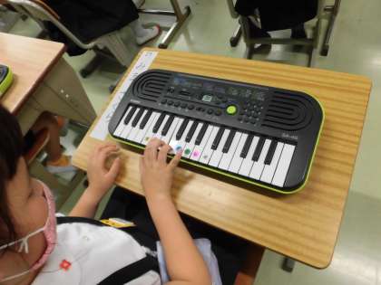 1年1組 音楽 電子キーボードを使って 公開日 2021/05/11 更新日 2021/05/11 1年 初めて使う電子キーボード。 電源の入れ方から指導します。 コロナ禍の中,鍵盤ハーモニカを使うことができず、1人に1台の電子キーボードを使って授業を進めます。