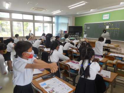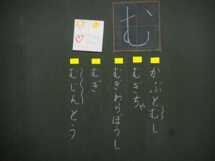 言葉集めの後,体を鉛筆のようにして,大きく「む」の字を書きました。