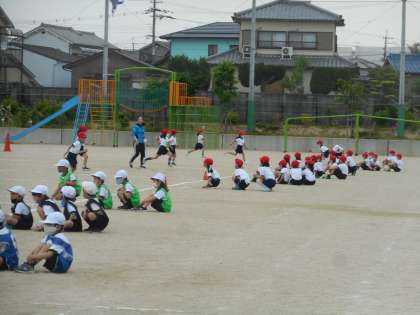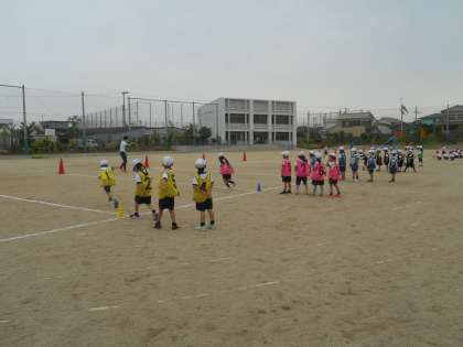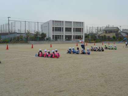 1年の体育の学習です。2つのクラスがとなりどうしで学習しています。