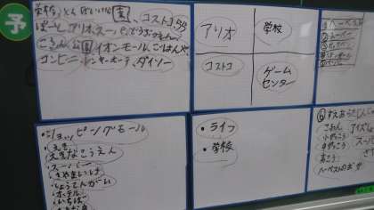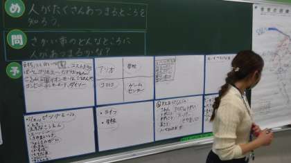 堺市で人がたくさん集まるところについて考えています。 ホワイトボードで予想を立て,考えていました。