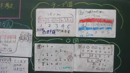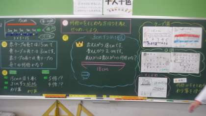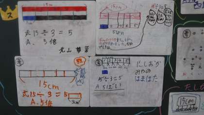 何倍なのかを考える問題をしています。 テープ・図などの考えがでていました。