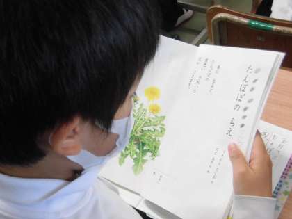 教科書を読んで、たんぽぽのかしこいと思ったところに線を引いていました。
