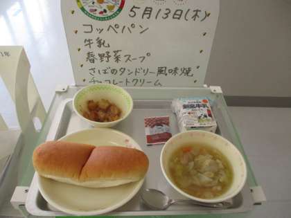 今日のスープは「春野菜スープ」です。春野菜とは、春が旬の野菜です。旬の食材は、たくさんとれて味もよくなります。スープの具材で、春野菜を見つけることができますか?「きぬさや」「キャベツ」「たまねぎ」の3種類が入っています。春野菜はやわらかく、あま味があります。春を感じて食べてください。