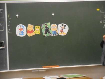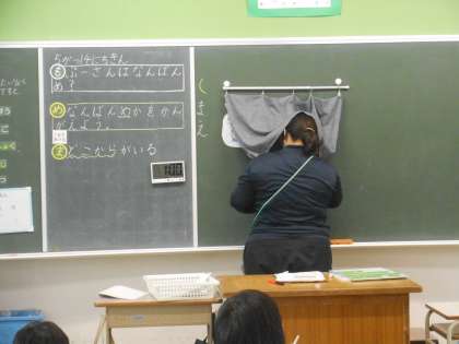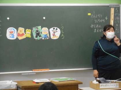 「なんばんめ」の学習です。カーテンの下で,先生がキャラクターの順番を並び替えています。