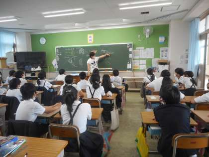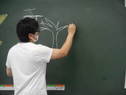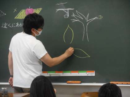 「葉っぱは筆をうまく置くことで,表せる」など,先生の話にみんな聞き入っていました。
