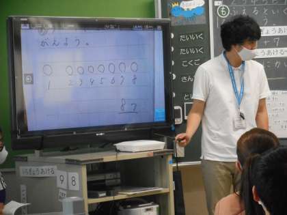 ノートを写真にとり,テレビに映して説明しています。