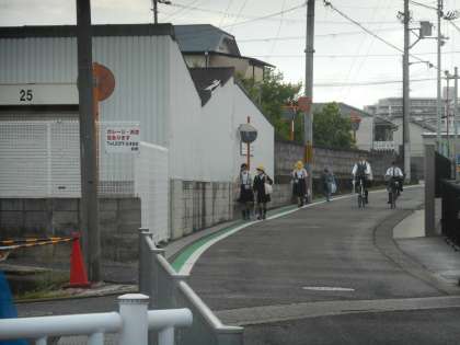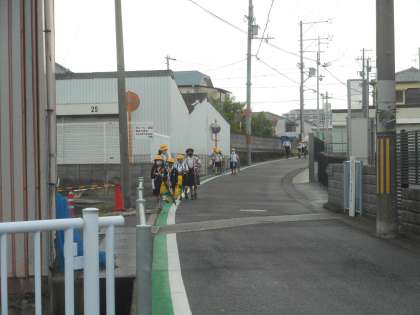 けさの登校のようすです。小雨がぱらついたりやんだりしています。