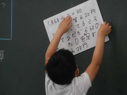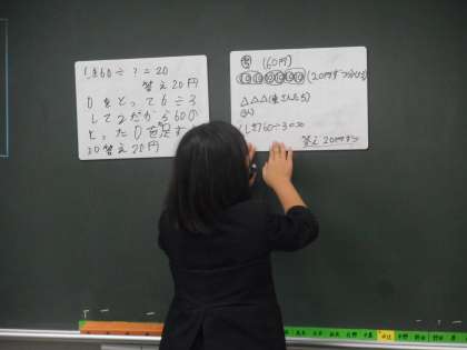 いくつかの考えを,白板に書いて貼り,みんなで考えていきます。