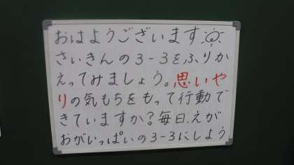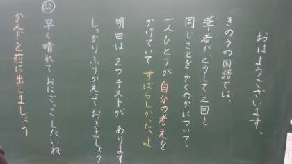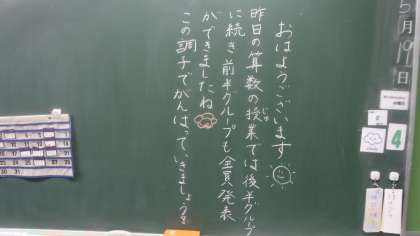 朝登校すると 公開日 2021/05/19 更新日 2021/05/19 校内研修 朝登校すると,黒板に先生からメッセージが書かれているクラスがあります。 昨日の学習のことであったり,よかったことが書かれていたりします。