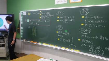 モンシロチョウの卵を観察しています。 「え〜」や「お〜」など反応豊かなクラスです。