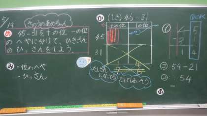 45−31の計算の仕方について考えています。 先生が一人ひとりに丁寧に声をかけながら学習しています。