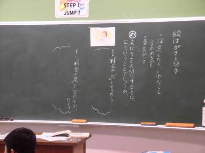 4年3組 道徳 「絵はがきと切手」 公開日 2021/05/19 更新日 2021/05/19 4年 「友だちを大切にする」ということは,どういうことだろう。 はがきと切手の料金不足という一場面から考えていました。