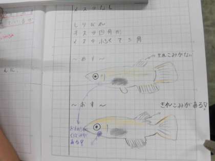 メダカのオスとメスを絵にかいてちがいを見つけていました。