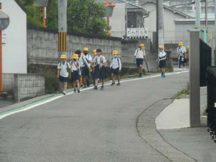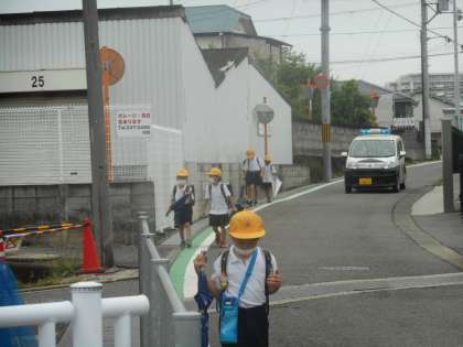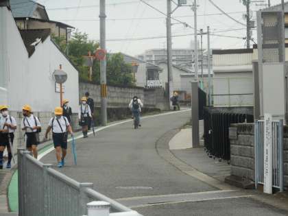 けさの登校のようすです。雨は時々ぱらつきますが,傘をさすほどではありません。