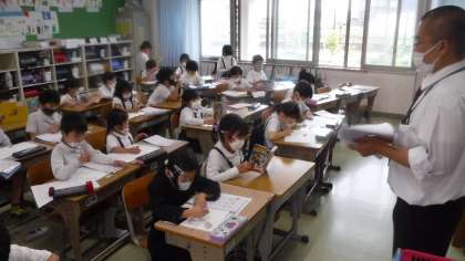 奥村先生がお休みのため自習をしています。 この時間は,日野先生が入っています。みんな頑張っています。