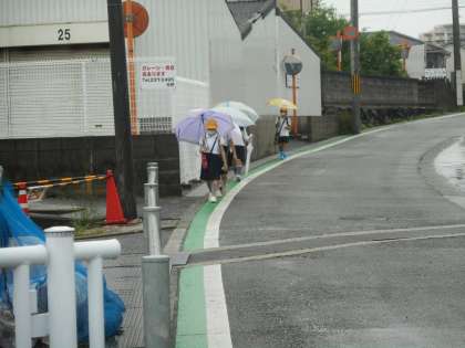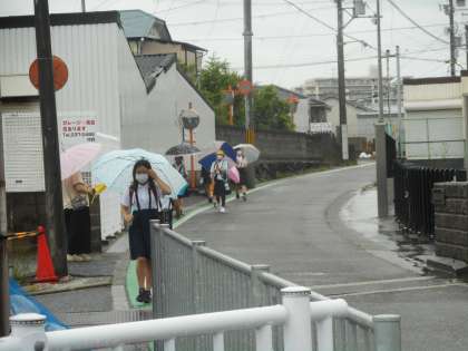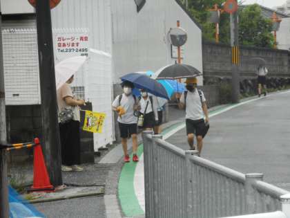 けさの登校のようすです。本降りの雨の中での登校となりました。