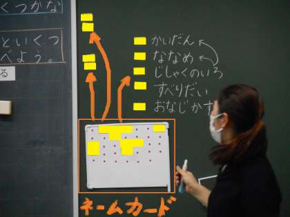 発言した人は,黒板にネームカードを貼っていきます。みんなが学習に参加できるようになるといいですね。