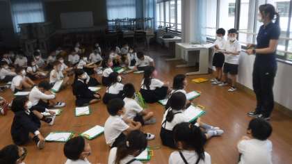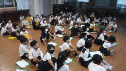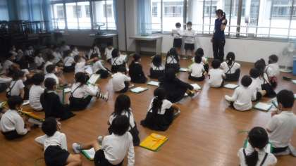 学校案内の練習をしています。2クラス合同で行っていました。