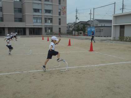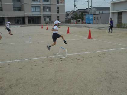 1年1組 体育 1 公開日 2021/05/24 更新日 2021/05/24 1年 1年体育の学習です。今日は小型ハードル1つがコースに入りました。スピードを落とさないで越えるにはどうしたらいいかを考えています。