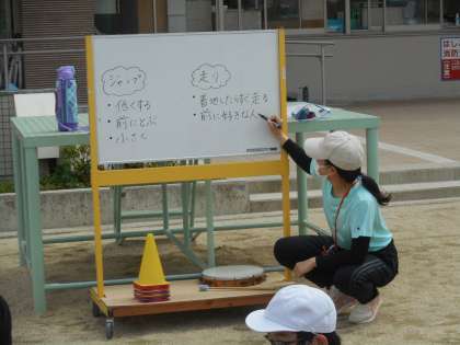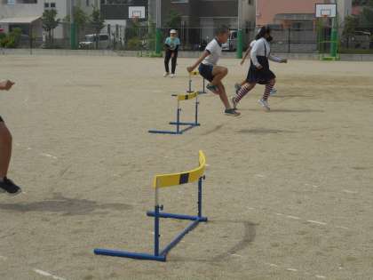 5年体育の学習です。ハードルを素早く越えることの大切さがわかってきました。