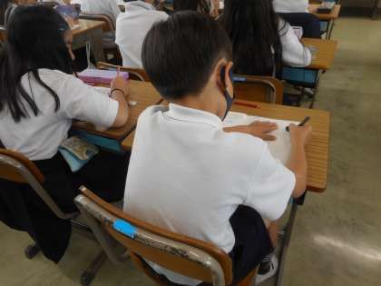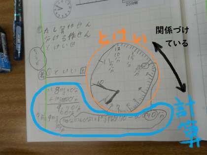 むずかしい学習ですが,みんなよくがんばっています。時計の図と計算で解く方法を関係づけて図に表している人がいました。よく考えています。