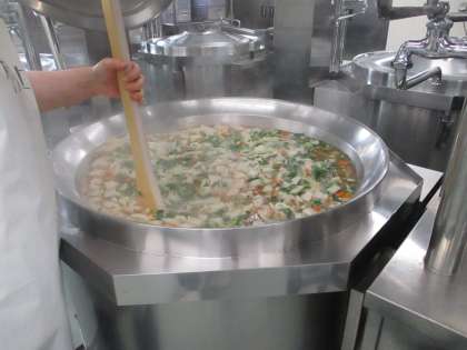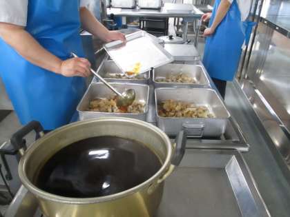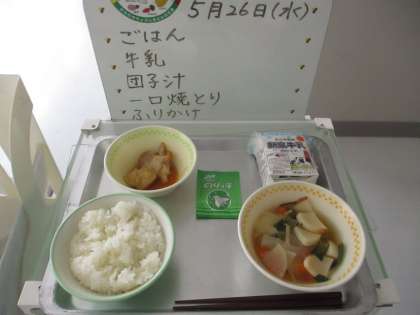 今日の小おかずは「一口焼とり」です。塩をふった鶏肉をオーブンで蒸し焼きにし、別に作ったタレをかけています。鶏肉は部位によって特長があり、それに合った料理があります。今日の鶏肉は「もも肉」で、しっかりした弾力とうま味があり、焼き物やから揚げなどに使います。手羽の部分は脂肪が多く、スープや揚げ物に使います。ささみはやわらかくて脂肪が少ないので、蒸し物に使うとおいしいです。