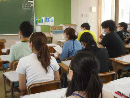 昨日,6年研究授業の模擬授業を行いました。先生が児童役になって,解決への見通しを出し合っています。