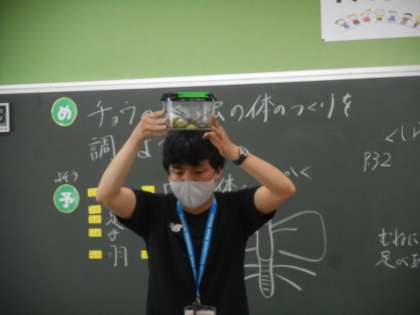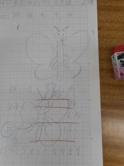 足が胸から出ていることなど,調べてみると,予想とは違っていることがわかりました。教室で飼育しているさなぎが,もうすぐチョウになるそうです。楽しみですね。