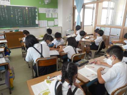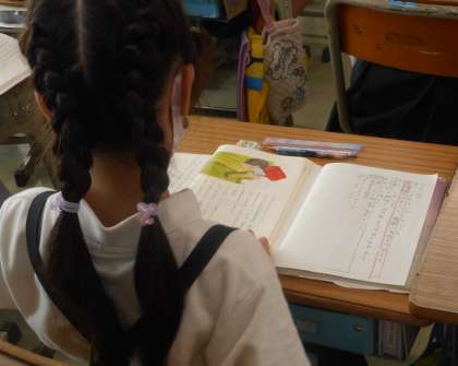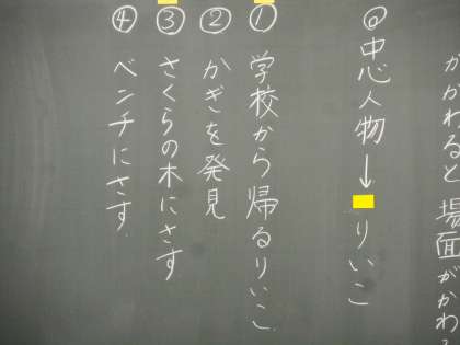 はじめから4つの場面がわかりました。場面分けの仕方がわかってきたところで,5つ目の場面がどこまでかを考えています。