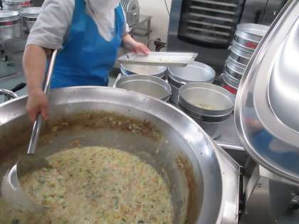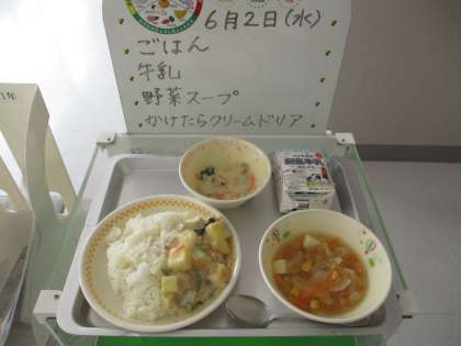 今日は、ごはんに小おかずをかけて食べる「かけたらクリームドリア」です。「ドリア」という料理は、「ライスグラタン」とも呼ばれています。その名のとおり、ごはんの上に、グラタンに使うホワイトソースをかけて作ります。チーズをかけて焼くと、見た目にもグラタンとそっくりです。この料理は、外国から伝わったのではなく、日本のホテルで働くヨーロッパの料理人が考え出したといわれています。料理の由来を調べてみるのもおもしろいですね。