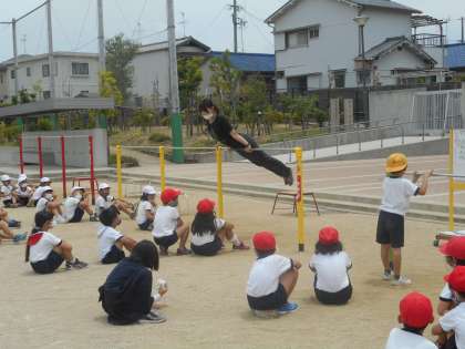 鉄棒に上がっての技「つばめ」のお手本を先生が見せています。みんななかなか上手にできていました。