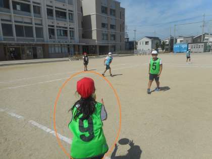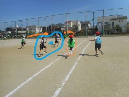パスを受けた黄緑9番の人が,素早くゴールに向かって走ります。サイドのゾーンはボールを持って走れます。左から味方が攻め上がり,相手(水色囲み)は守りにもどっています。