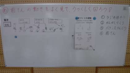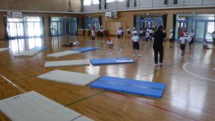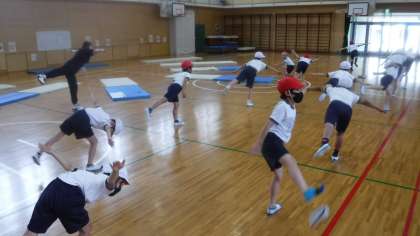 まず,準備運動をしていました。先生がヨガインストラクターのような動きで美見本を見せています。