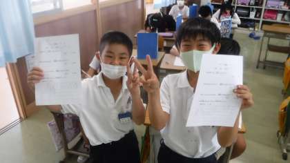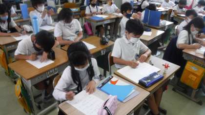 体育の後に,ふりかえりを書いています。文字化することで今日の学習についてだけではなく,情意面なども丁寧にみることができます。1年生から書いているのでみんな書くことに慣れています。