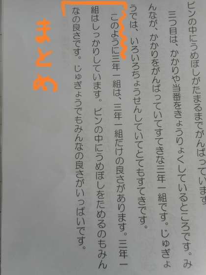 3年1組の説明文 4 公開日 2021/06/03 更新日 2021/06/03 3年 「まとめ」の部分です。「このように」で「なか」の部分の内容を受けて,まとめにつなげています。学習したことを生かして,説明文を書くことができましたね。