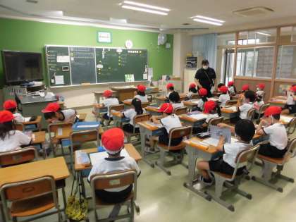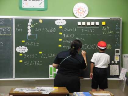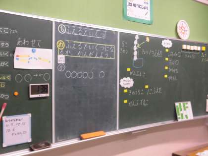 「あわせる」・「ふえる」ということについて,子どもたちのつぶやきからブロックの操作,みんなの前で説明と授業が進んでいます。