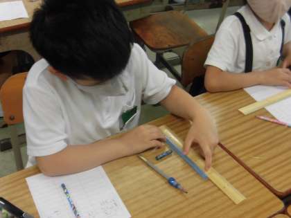 はしをそろえて「ものさし」(定規)を使っていろいろなものをはかっています。