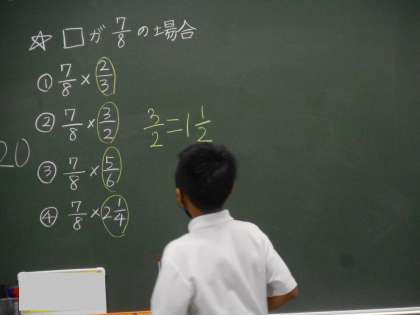 かける数が仮分数の場合は,1より大きいということなので,計算しなくても,答えがかけられる数より大きくなるとわかる と説明しています。