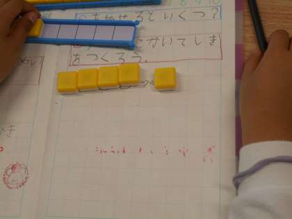 図を描いた後に,ブロックを置いて確かめています。