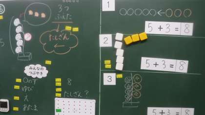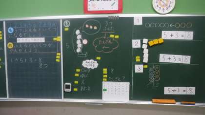 今日の板書です。 子どもたちの考えが前に書かれたものを,整理しています。 授業の最後にふりかえりを書いています。