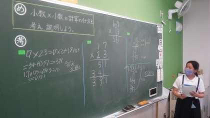 5年2組 算数 公開日 2021/06/09 更新日 2021/06/09 5年 小数×小数の計算の仕方について考えています。 小数点の位置について,考えを深めていました。 子どもたちのノートを見ながら,先生が「なぜこのようになるの」「ここはどう考えたの」など,さらに深く考えるように声をかけていました。