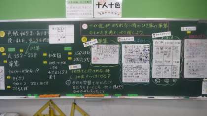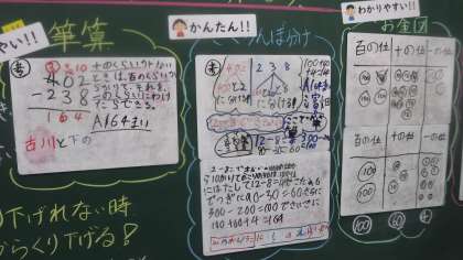 3桁ひく3桁の筆算について考えていました。たくさんの考えを整理しています。
