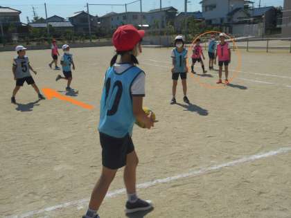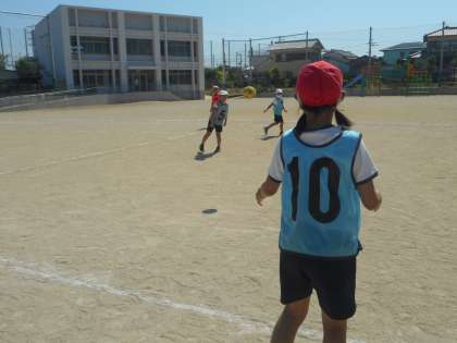 4年体育 ラインポートボール 9 公開日 2021/06/10 更新日 2021/06/10 4年 パスを受けたラインマン(10番)は前のプレーヤーへのパスを考えましたが,相手が近くにいるのが分かったので,フリーの5番へのパスを選びました。5番はすかさずシュート,ゴールマンも連動していました。