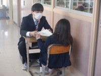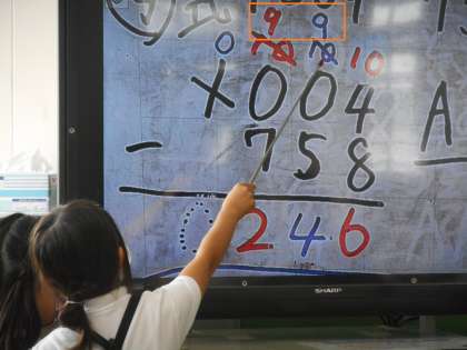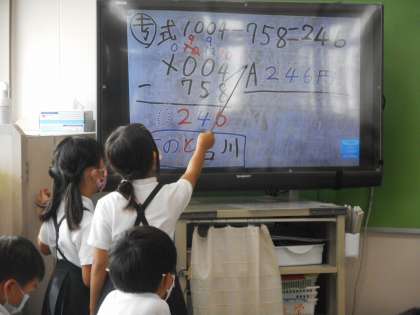 みんなに考えを説明しています。ひっ算で計算した人たちですが,なぜ,十・百の位が「9」になるのか,疑問が出ました。