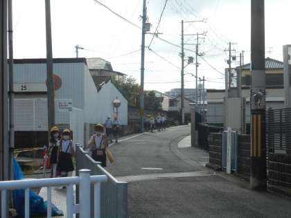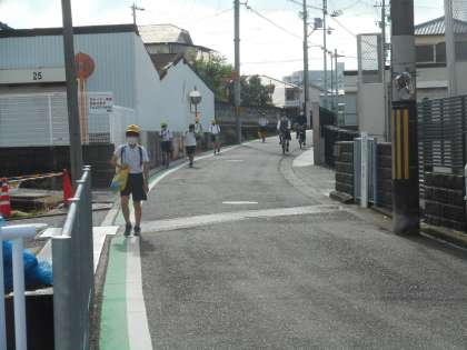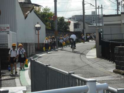 けさの登校のようすです。雨はあがりましたが,蒸し暑い日です。
