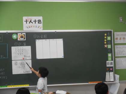 各自の考えを発表しています。前の時間に学習したことをもとにして,ひっ算で計算した人が説明しています。