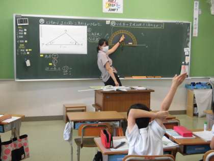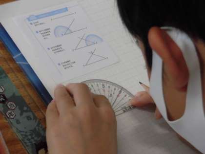 4年4組 算数 「分度器を使って三角形をかこう」 公開日 2021/06/14 更新日 2021/06/14 4年 分度器のあて方、左右どちらからの角度を読む?などを確認しながら、間違わないように丁寧に指導していました。