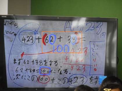 計算の仕方を工夫して,答えを出すことを学習しています。前から順にたすのではなく,わかりやすい数になるように,計算の順番を変えています。